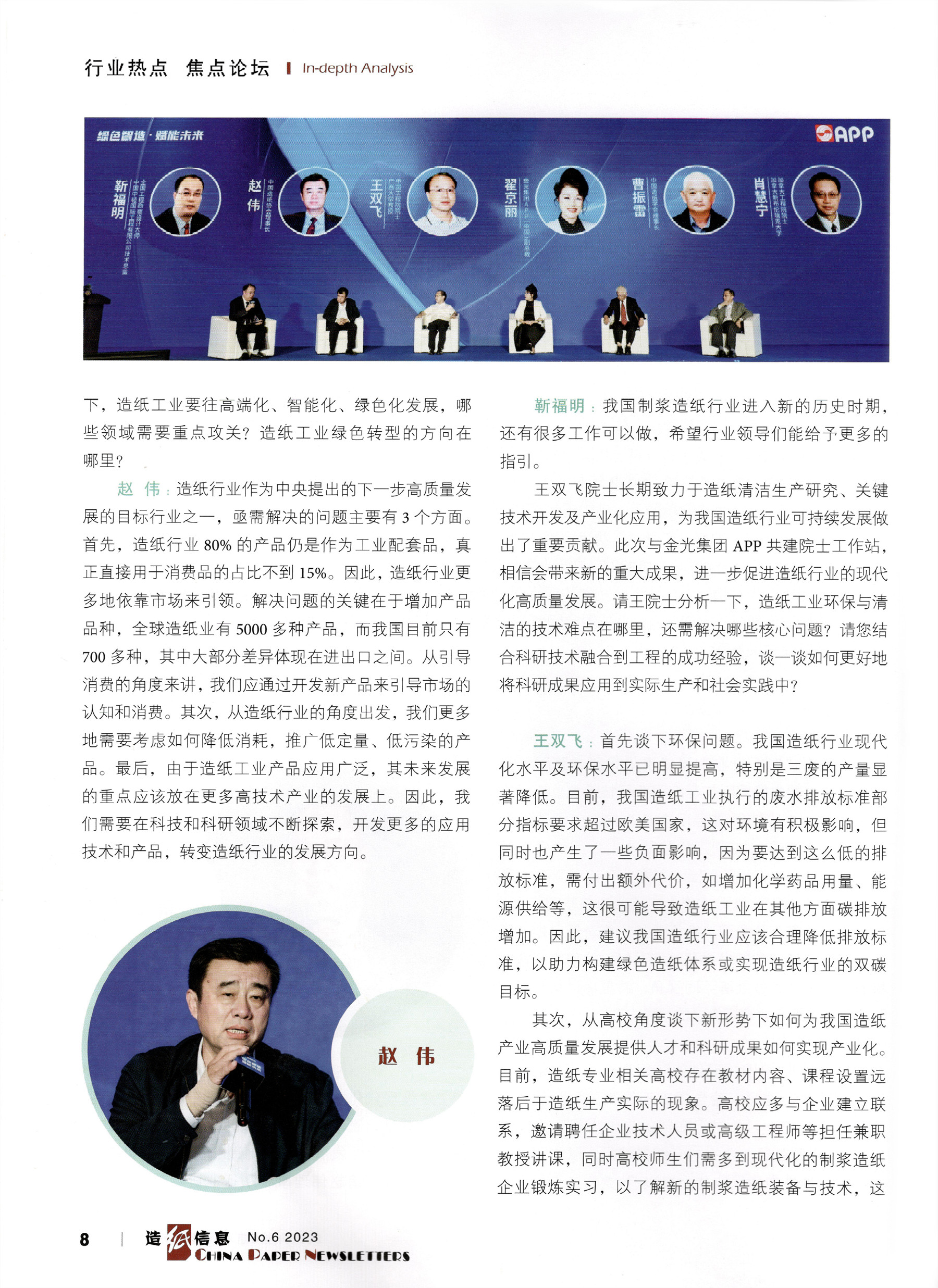 主题为“造纸行业中国式现代化新道路”的高峰对话由中国中轻国际工程有限公司技术总监靳福明 主持,特邀中国造纸协会理事长赵伟,中国造纸学 会理事长曹振雷,中国工程院院士、广西大学教授 王双飞,加拿大工程院院士、加拿大新布伦瑞克大学教授肖惠宁、金光集团 APP(中国)副总裁翟京丽 5位重量级嘉宾,从我国造纸行业如何应对新时期市场竞争环境、如何创新发展和转型升级、如何高质量发展及如何可持续发展等不同视角,着重探讨与分享了关乎我国造纸行业长远发展的精彩内容。